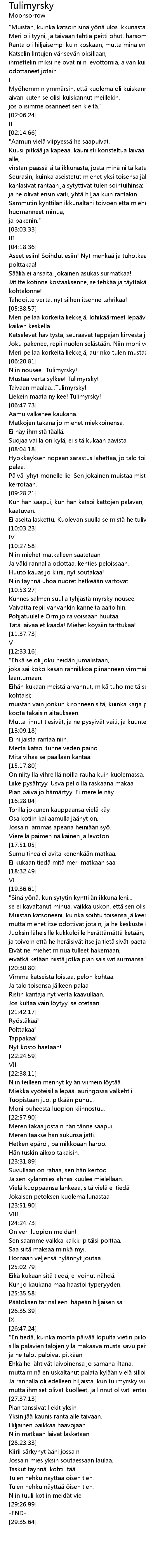| [13:03.46] | Mutta linnut tiesiv t, ja ne pysyiv t vaiti, ja kuuntelivat." |