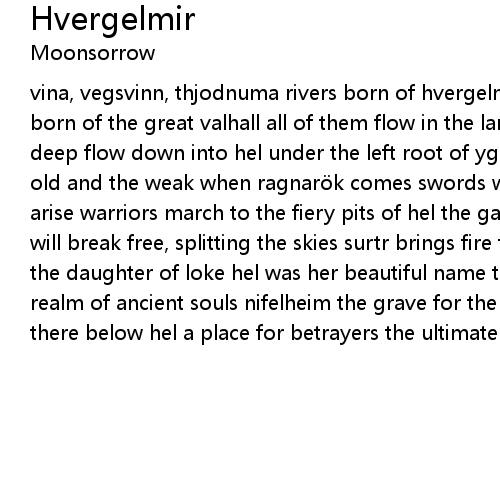 | vina, vegsvinn, thjodnuma rivers born of hvergelmir bjöll, strön, ylgr, leiptr born of the great valhall all of them flow in the lands of midgardr last they go deep flow down into hel under the left root of yggdrasil lies the place for the old and the weak when ragnarök comes swords will rise again thousands of bodies arise warriors march to the fiery pits of hel the gates are wide open fenris will break free, splitting the skies surtr brings fire from the south ruled by the daughter of loke hel was her beautiful name the rivers run blood of the weak realm of ancient souls nifelheim the grave for the fools odin's men didn't sleep there below hel a place for betrayers the ultimate punishment |