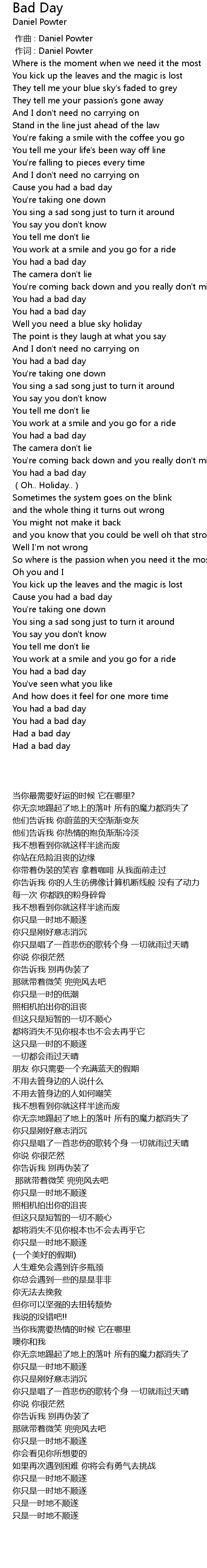 | [00:00.00] | 作曲 : Daniel Powter |