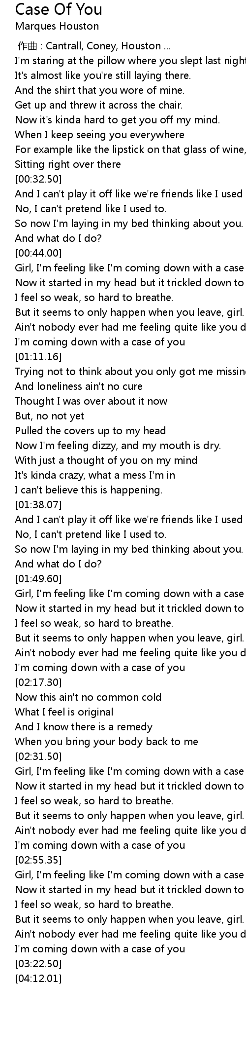 | [02:56.35] | Girl, I'm feeling like I'm coming down with a case of you. |