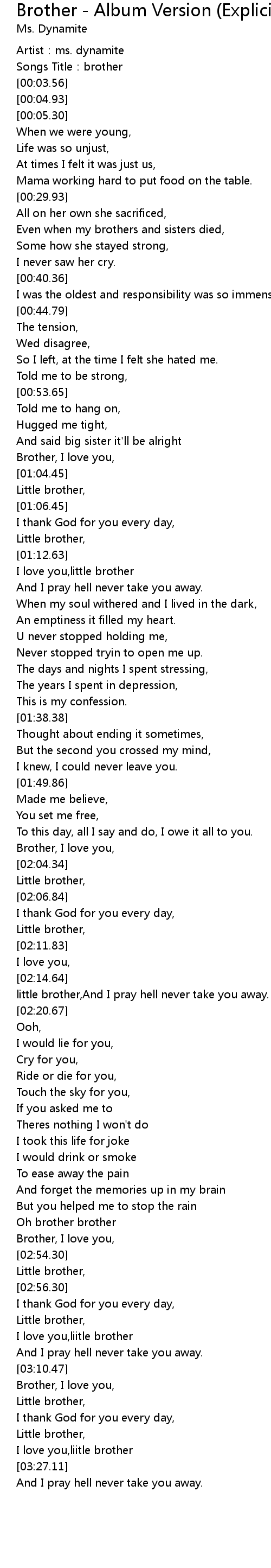 | [02:15.55] | little brother, And I pray hell never take you away. |