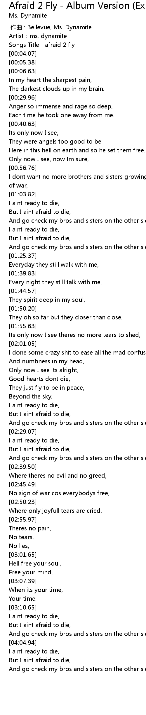 | [00:02.45] | Songs Title:afraid 2 fly |