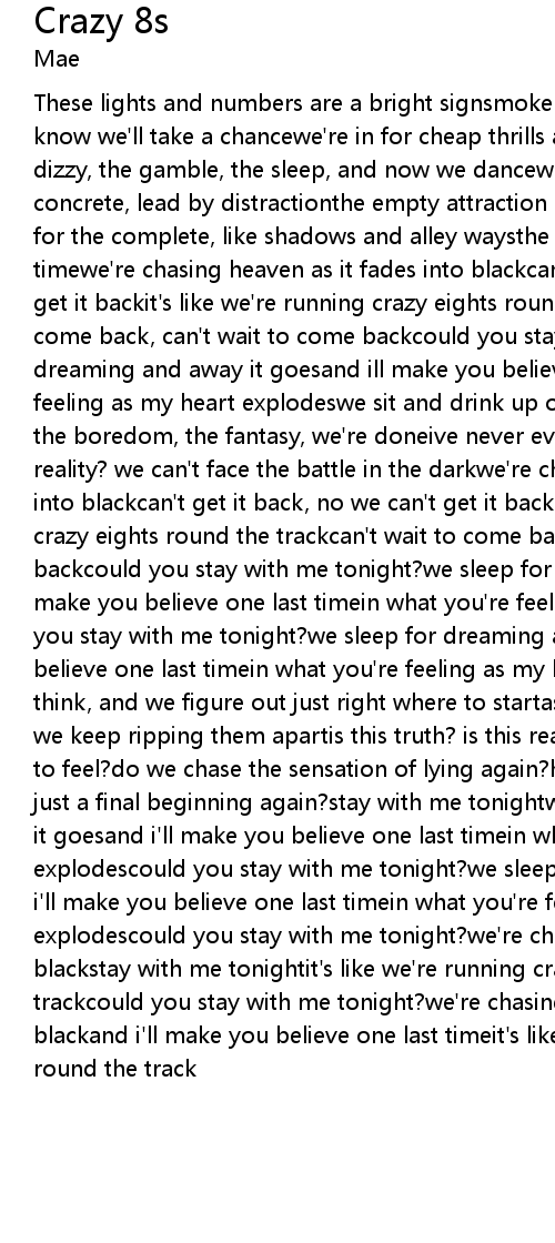 These lights and numbers are a bright signsmoke filled casinos but what do we know we'll take a chancewe're in for cheap thrills and fast ridesspin till we're dizzy, the gamble, the sleep, and now we dancewe stumble up and down the concrete, lead by distractionthe empty attraction keeps up blindnever intending for the complete, like shadows and alley waysthe unknown continues buying timewe're chasing heaven as it fades into blackcan't get it back, no we can't get it backit's like we're running crazy eights round the trackcan't wait to come back, can't wait to come backcould you stay with me tonight?we sleep for dreaming and away it goesand ill make you believe one last timein what you're feeling as my heart explodeswe sit and drink up on the cop carplaying illegally the boredom, the fantasy, we're doneive never ever loved you so hardbut is that reality? we can't face the battle in the darkwe're chasing heaven as it fades into blackcan't get it back, no we can't get it backit's like we're running crazy eights round the trackcan't wait to come back, can't wait to come backcould you stay with me tonight?we sleep for dreaming and away it goesand ill make you believe one last timein what you're feeling as my heart explodescould you stay with me tonight?we sleep for dreaming and away it goesand i'll make you believe one last timein what you're feeling as my heart explodeswe sit, we think, and we figure out just right where to startas these waters rush together, we keep ripping them apartis this truth? is this real? is there something more to feel?do we chase the sensation of lying again?have we now reached the end, just a final beginning again?stay with me tonightwe sleep for dreaming and away it goesand i'll make you believe one last timein what you're feeling as my heart explodescould you stay with me tonight?we sleep for dreaming, away it goesand i'll make you believe one last timein what you're feeling as my heart explodescould you stay with me tonight?we're chasing heaven as it fades into blackstay with me tonightit's like we're running crazy eights round the trackcould you stay with me tonight?we're chasing heaven as it fades into blackand i'll make you believe one last timeit's like we're running crazy eights round the track |
