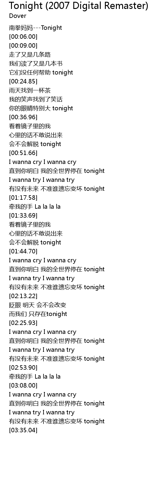 | [00:01.00] | 南拳妈妈---Tonight |