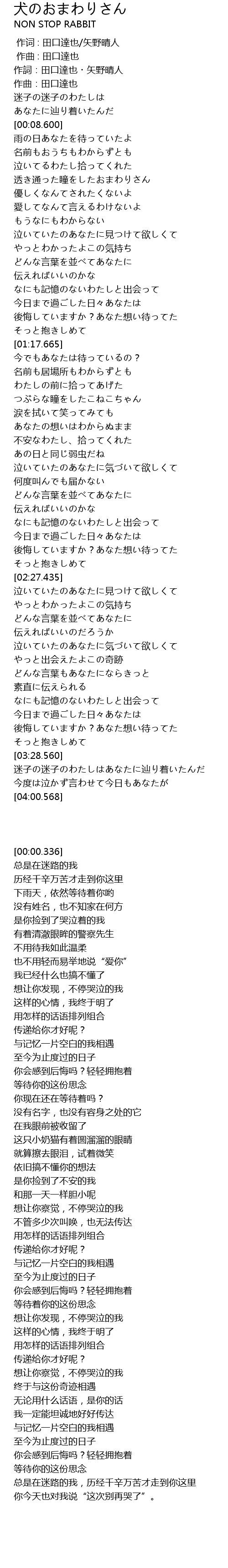 | [00:00.336] | 作詞:田口達也・矢野晴人 |