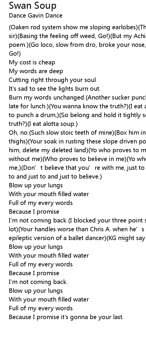 | Burn my words unchanged.(Another sucker punch,)(You were late for dinner, I was late for lunch.)(You wanna know the truth?)(I eat alotta soup)(What’s it like to punch a drum,)(So belong and hold it tightly son.)(You wanna know the truth?)(I eat alotta soup.) | |