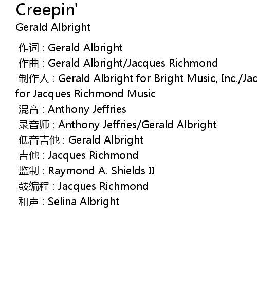 | [00:00.000] | zhì zuò rén : Gerald Albright for Bright Music, Inc. Jacques Richmond for Jacques Richmond Music |