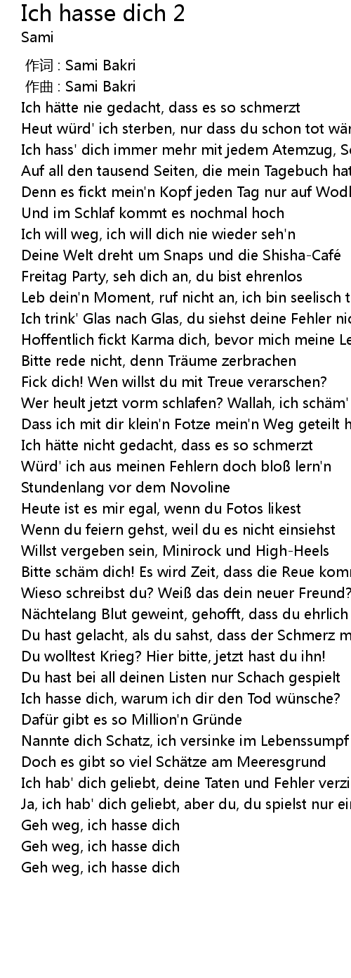 | [01:42.05] | Ich hasse dich, warum ich dir den Tod wü nsche? |