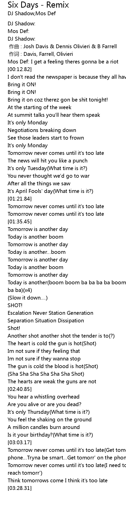 | [03:04.60] | Tomorrow never comes until it's too late(Get tomorr' on the phone…Tryna be smart…Get tomorr' on the phone) |