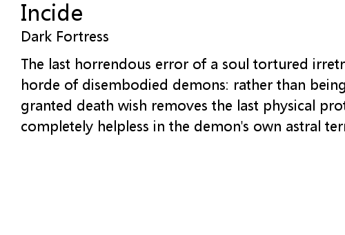 | The last horrendous error of a soul tortured irretrievably into insanity by A horde of disembodied demons: rather than being the last desperate way out The granted death wish removes the last physical protection and renders the Soul completely helpless in the demon's own astral territory... |