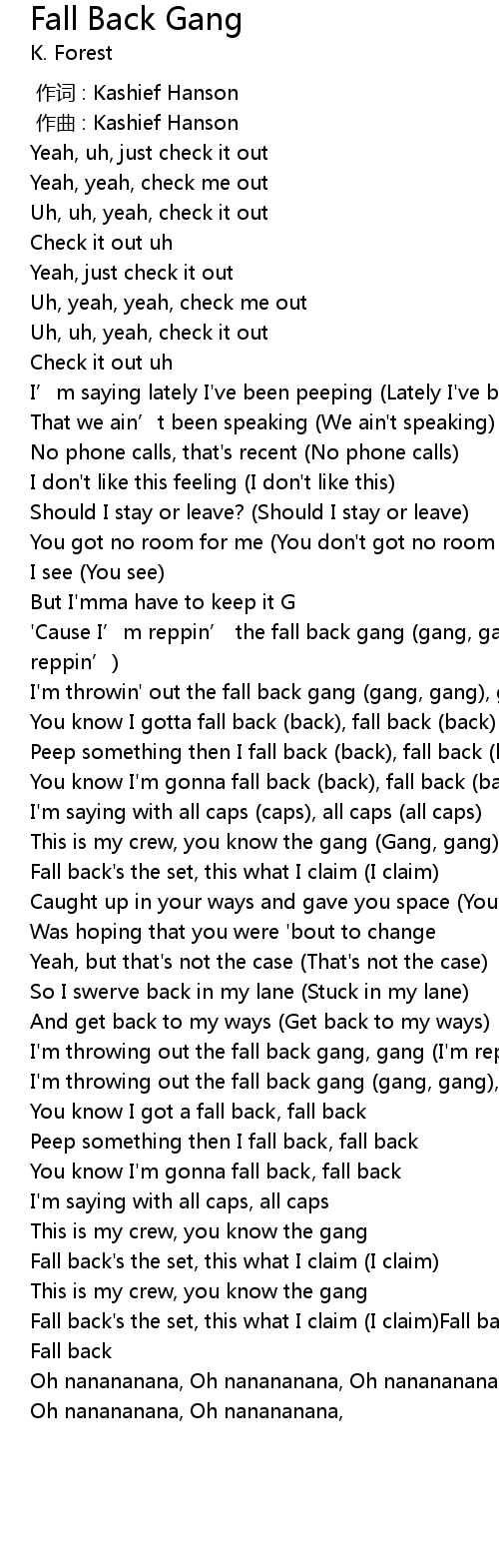 | [00:48.86] | ' Cause I' m reppin' the fall back gang gang, gang, gang I' m reppin' |