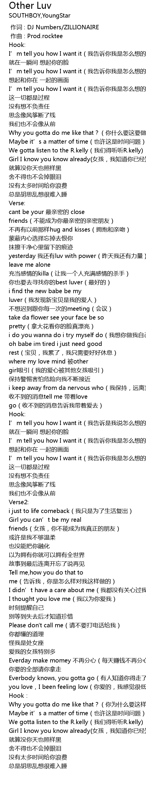 | [02:42.864] | Why you gotta do me like that? ni wei shi me yao zhe yang zuo |