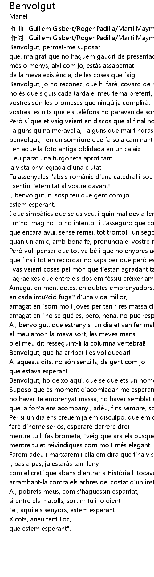 | [00:01.00] | 作词 : Guillem Gisbert/Roger Padilla/Martí Maymó/Arnau Vallvé |