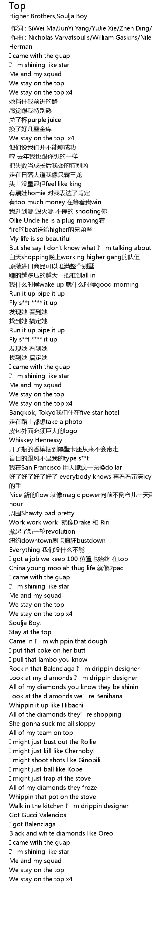 | [01:01.582] | Ollie Uncle he is a plug moving zhe fire de beat sòng gěi higher de xiōng dì xiē |