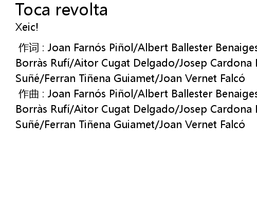 | [00:00.000] | 作词 : Joan Farnós Piñol/Albert Ballester Benaiges/Román Borràs Rufí/Aitor Cugat Delgado/Josep Cardona Pallares/Jordàn Rius Suñé/Ferran Tiñena Guiamet/Joan Vernet Falcó |