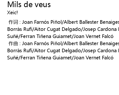 | [00:00.000] | zuò qǔ : Joan Farnó s Pi ol Albert Ballester Benaiges Romá n Borrà s Rufí Aitor Cugat Delgado Josep Cardona Pallares Jordà n Rius Sué Ferran Ti ena Guiamet Joan Vernet Falcó |