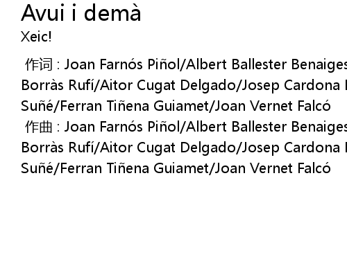 | [00:00.000] | zuò qǔ : Joan Farnó s Pi ol Albert Ballester Benaiges Romá n Borrà s Rufí Aitor Cugat Delgado Josep Cardona Pallares Jordà n Rius Sué Ferran Ti ena Guiamet Joan Vernet Falcó |