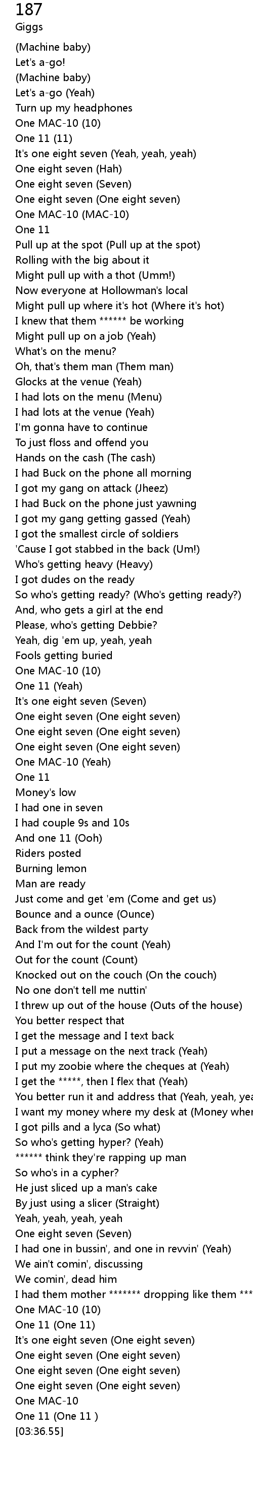 | [03:24.53] | It's one eight seven (One eight seven) |