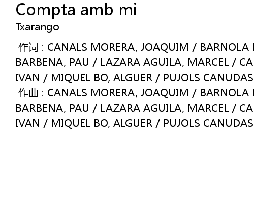 | [00:00.000] | 作词 : CANALS MORERA, JOAQUIM / BARNOLA FERRE, JORDI / PUIG BARBENA, PAU / LAZARA AGUILA, MARCEL / CARBONELL VERGES, SERGI / LOPEZ NAVARRO, IVAN / MIQUEL BO, ALGUER / PUJOLS CANUDAS, ALEXANDRE |