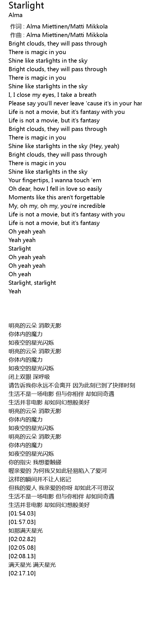 | [00:00.000] | 作词 : Alma Miettinen/Matti Mikkola |