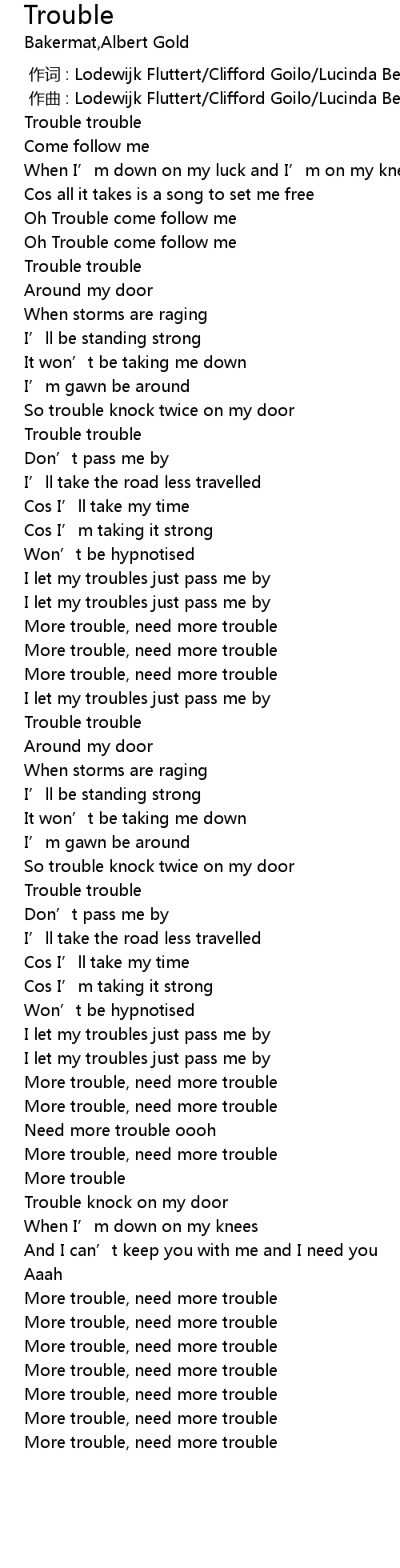 | [00:18.15] | Oh Trouble come follow me |