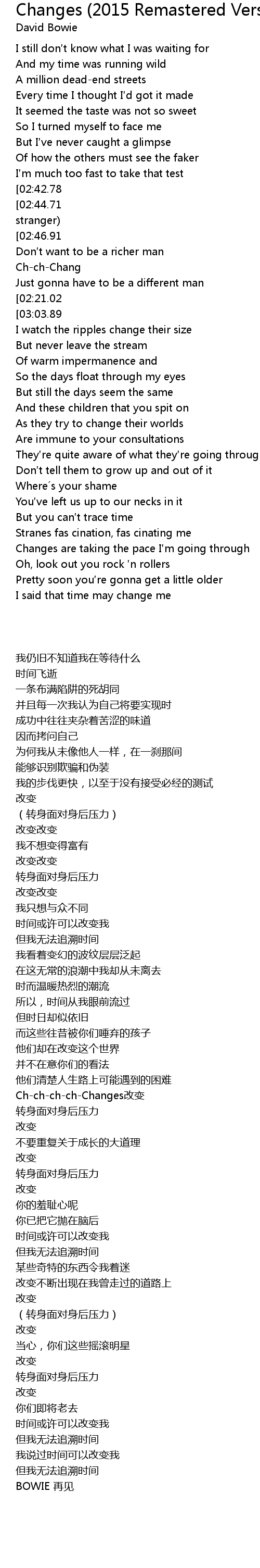 | [02:52.06][02:42.78][02:11.90][02:02.41][01:03.49][00:54.00] | Ch-ch-ch-ch-Changes |