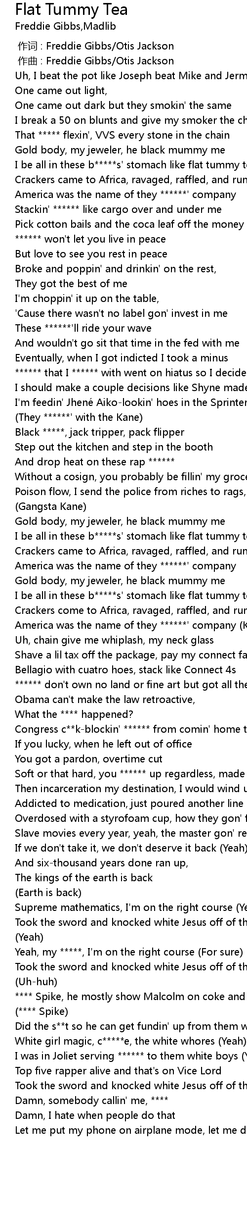 | [00:58.46] | I be all in these b*****s' stomach like flat tummy tea |