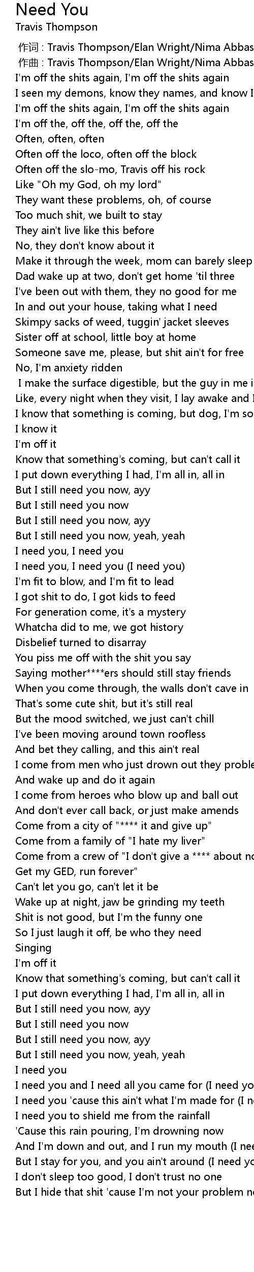 | [00:00.000] | zuo ci : Travis Thompson Elan Wright Nima Abbassi |