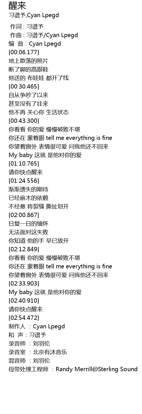| [03:15.134] | mu dai chu li gong cheng shi : Randy Merrill Sterling Sound |