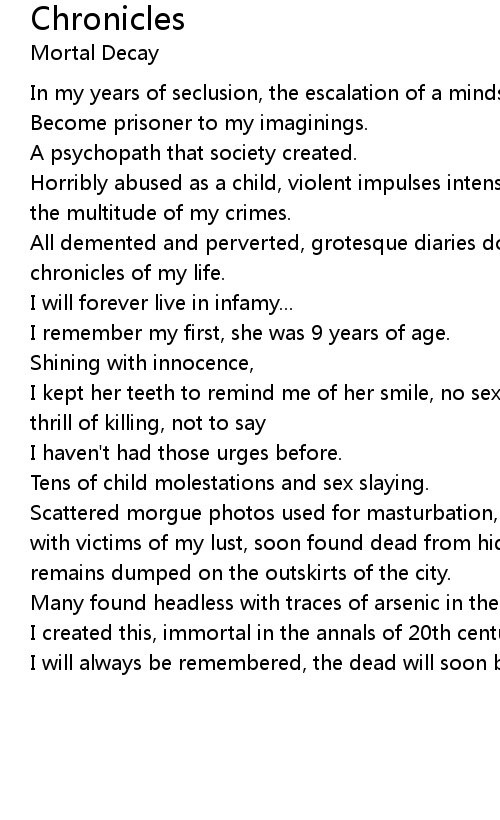 All demented and perverted, grotesque diaries document in explicit detail the chronicles of my life. |