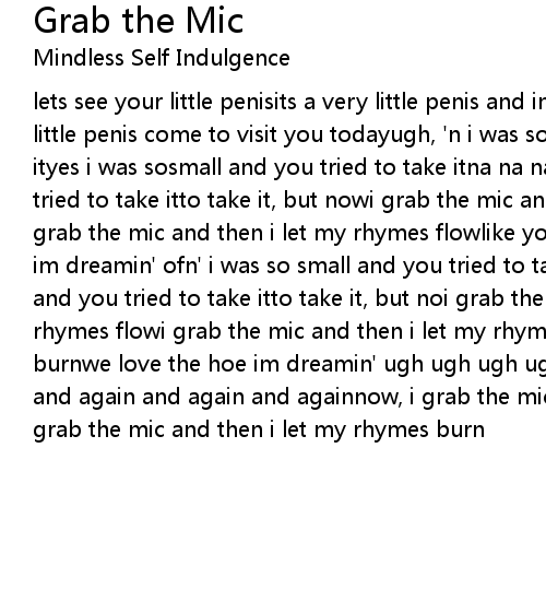lets see your little penisits a very little penis and im very happy to sayits a little penis come to visit you todayugh, 'n i was so small and you tried to take ityes i was sosmall and you tried to take itna na na oh i was so small and you tried to take itto take it, but nowi grab the mic and then i let my rhymes flowi grab the mic and then i let my rhymes flowlike you, i need to burnwe love the ho im dreamin' ofn' i was so small and you tried to take na na nan' i was so small and you tried to take itto take it, but noi grab the mic and then i let my rhymes flowi grab the mic and then i let my rhymes flowlike you, i need to burnwe love the hoe im dreamin' ugh ugh ugh ugh ofeverything old is new again and again and again and againnow, i grab the mic and then i let my rhymes flowi grab the mic and then i let my rhymes burn |