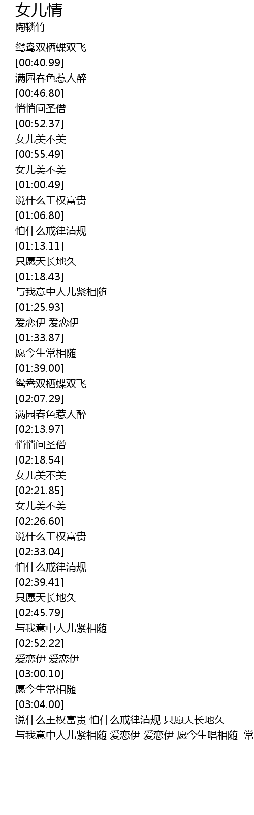 | [03:08.76] | 说什么王权富贵 怕什么戒律清规 只愿天长地久 与我意中人儿紧相随 爱恋伊 爱恋伊 愿今生唱相随 常相随 |