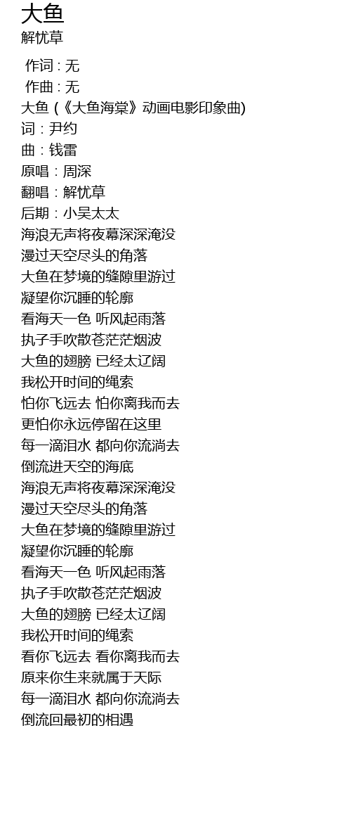 | [00:10.192] | 大鱼 (《大鱼海棠》动画电影印象曲) |