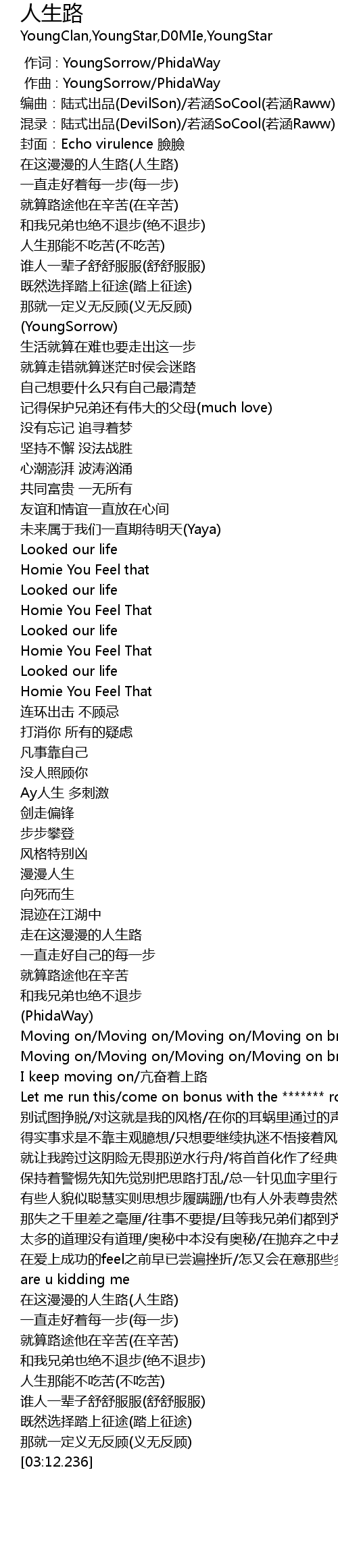 | [01:53.733] | I keep moving on kàng fèn zhe shàng lù |
