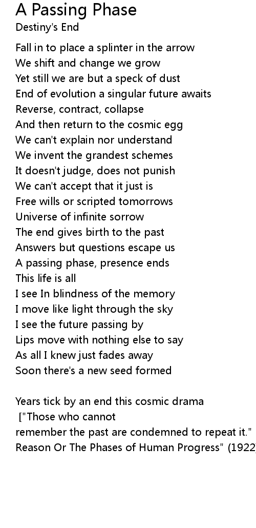 Melting away as the cycle begins again-identical [Chorus] ["Those who cannot remember the past are condemned to repeat it." - George Santyana, "The Life Of Reason Or The Phases of Human Progress" (1922)] |