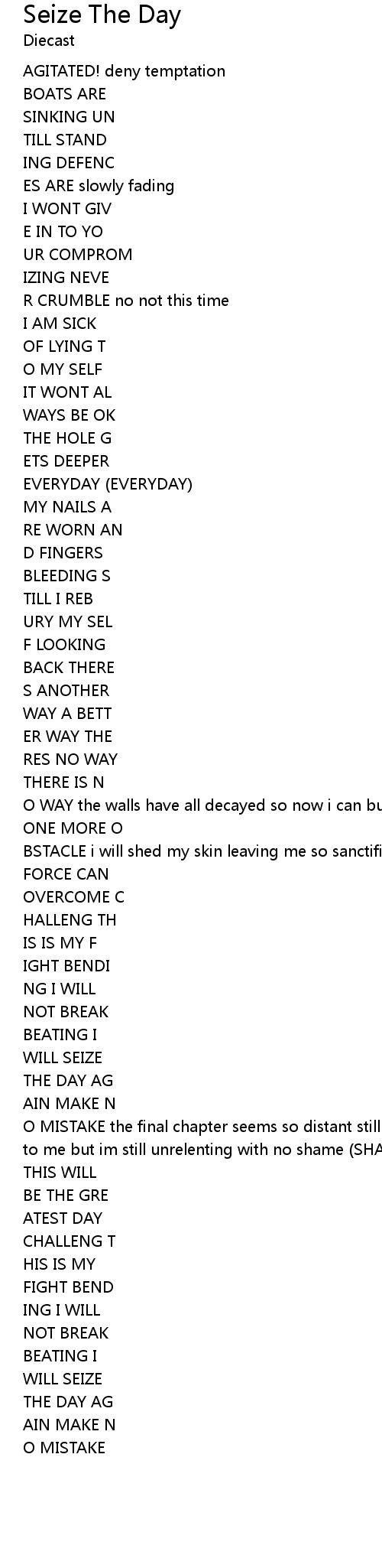 O MISTAKE the final chapter seems so distant still i carry on my own head calls to me but im still unrelenting with no shame (SHAME) i take aim (AIM) |
