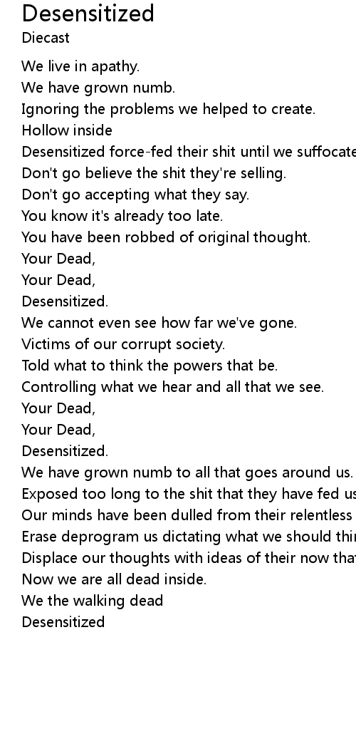 Desensitized force-fed their shit until we suffocate. |