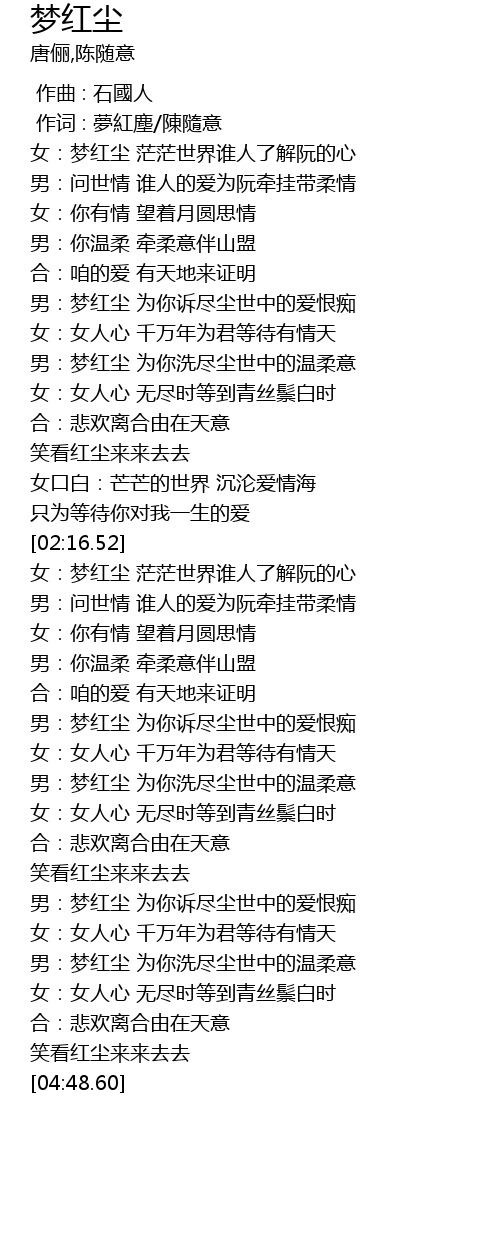 | [04:16.00] | 男:梦红尘 为你洗尽尘世中的温柔意 |