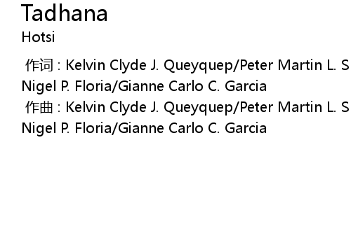 | [00:00.000] | 作曲 : Kelvin Clyde J. Queyquep/Peter Martin L. Sunga/Charles Nigel P. Floria/Gianne Carlo C. Garcia |