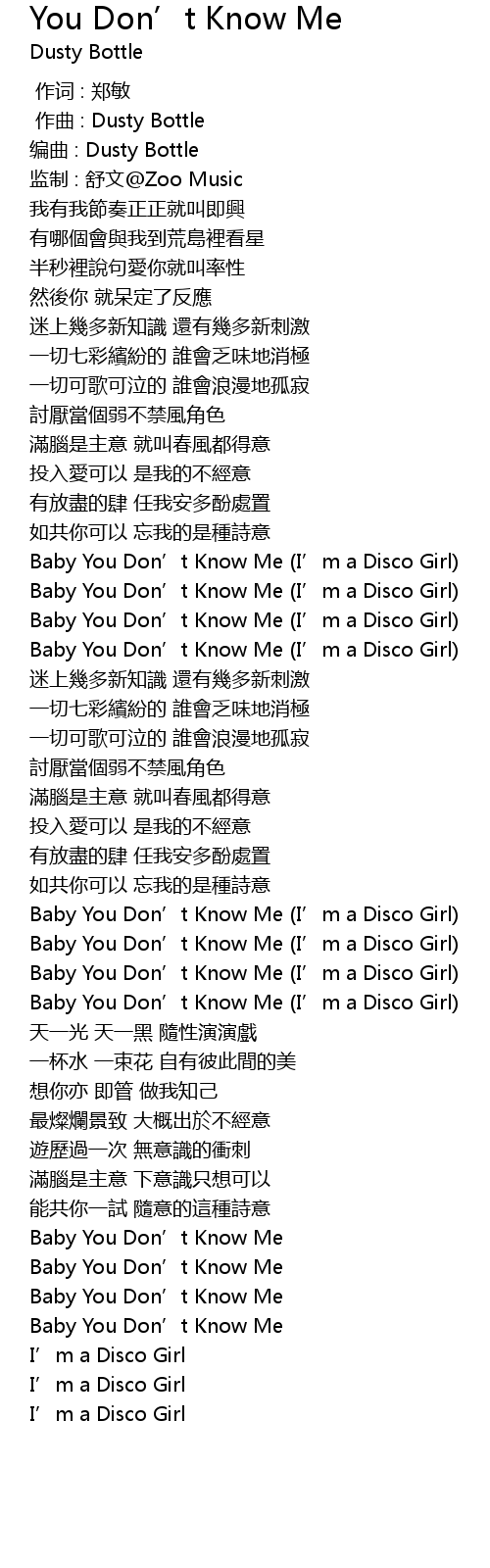 | [02:17.66] | Baby You Don' t Know Me I' m a Disco Girl |