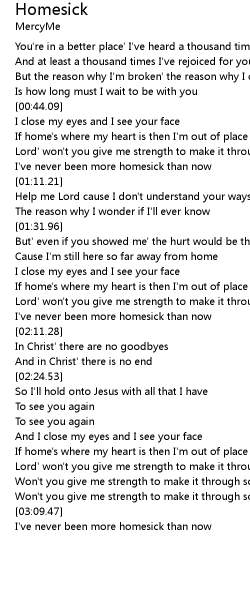 | [02:06.28] | I've never been more homesick than now |