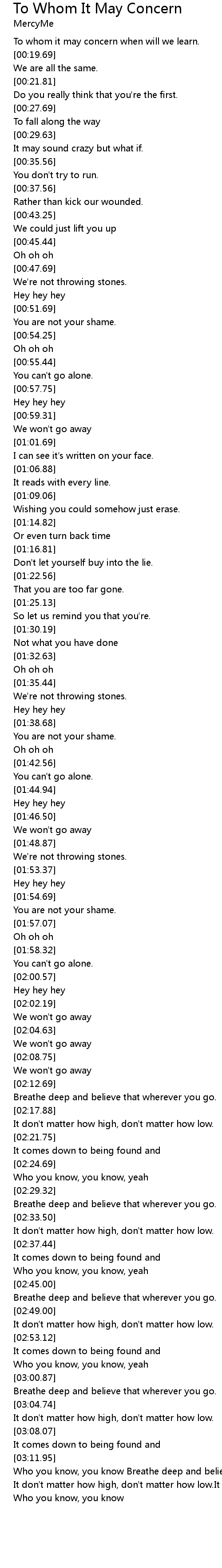 Who you know, you know Breathe deep and believe that wherever you go It don't matter how high, don't matter how low.It comes down to being found and Who you know, you know |