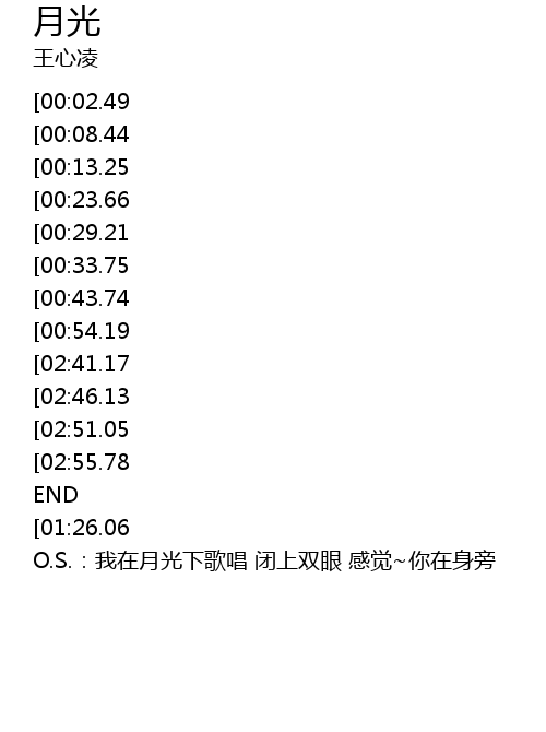 | [03:09.78] | O.S.:我在月光下歌唱 闭上双眼 感觉~你在身旁 |