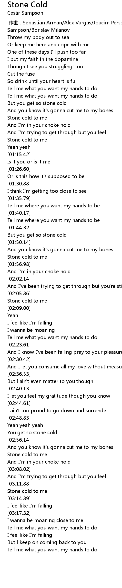 | [03:00.54] | Stone cold to me |