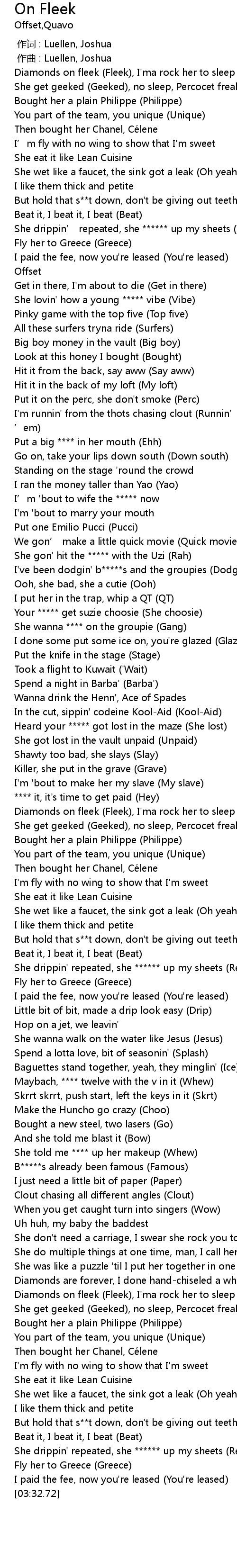 | [03:26.52] | She drippin' repeated, she ****** up my sheets (Repeat) |