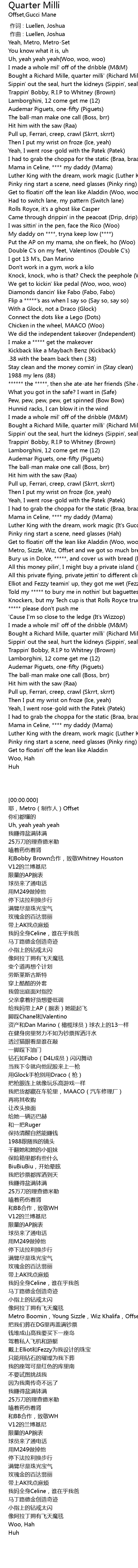 | [01:58.129] | Metro, Sizzle, Wiz, Offset and we got so much bread Wop |