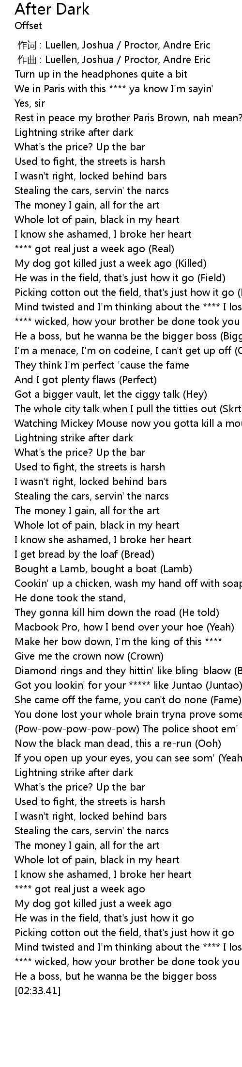 | [00:33.29] | Whole lot of pain, black in my heart |
