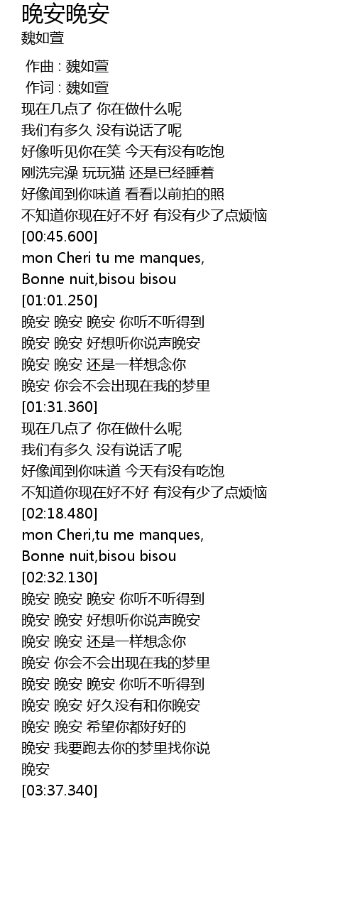 | [02:41.740] | wǎn ān wǎn ān hǎo xiǎng tīng nǐ shuō shēng wǎn ān |