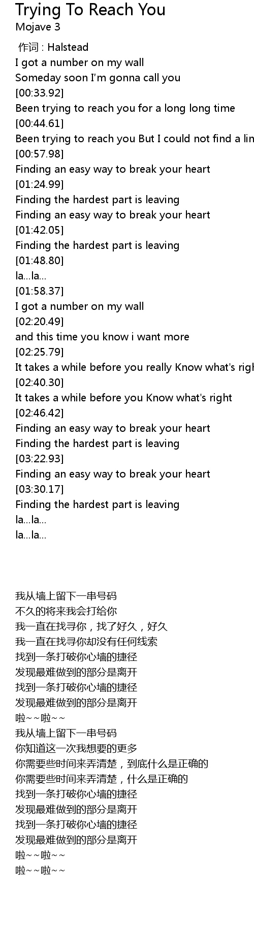 | [00:50.37] | Been trying to reach you But I could not find a line |