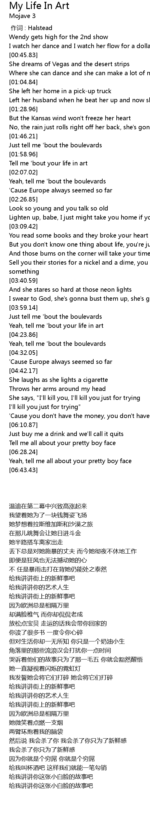 | [04:19.61] | Yeah, tell me 'bout your life in art |